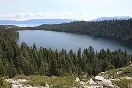 Cascade Lake (California) is a glacier formed lake located in El Dorado County, California approximately 1 kilometre (0.62 mi) from Lake Tahoe. Cascade Lake is the second largest tributary lake feeding into Lake Tahoe. Its depth is 170 feet (52 m), 1 mile (1.6 km) long and 0.5 miles (0.80 km) wide.[2] The lake is also within three to four miles from its neighboring lake, Fallen Leaf Lake (California), and Emerald Bay.