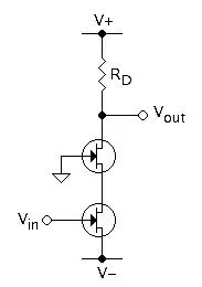 Figure 1 shows an example of a cascode amplifier with a common-source amplifier as the input stage driven by a signal source, Vin. This input stage drives a common-gate amplifier as the output stage, with output signal Vout.