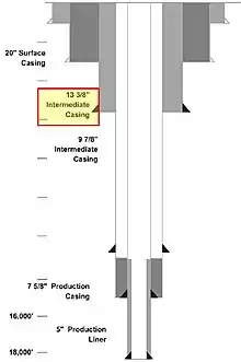 Intermediate, or protective, casing may be one or more strings of casing. Protective casing is most frequently installed in a well because of the mud weight required to drill deeper in the well. Common sizes of intermediate strings range from 7" to 10 ¾" (or larger in deep wells). Each string is cemented in place. Obviously, if several strings of intermediate casing are required in a well, the diameter of the surface hole must be large enough to permit all of the necessary strings. Wells are planned from the bottom up. The purpose of the well determines the diameter of the bottom of the well. If the well is an exploratory wild cat offshore, the bottom of the well must be only large enough to accommodate a logging sonde. If the well is a very productive oil well, a 7" production tubing might be installed in a larger diameter casing. Gas wells may only require a small 2 ⅞" tubing set in 4 ¾" casing, so the hole might be relatively small. With rank wildcats in geological basins that have not been explored extensively, the first holes might be large enough to provide for a couple of contingency strings of casing.