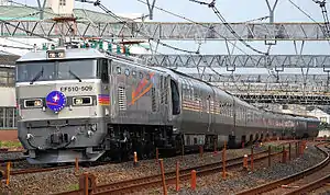 A Cassiopeia cruise train hauled by JR East Class EF64-1000 and EF81 electric locomotives in June 2016