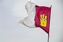 - One. The flag of the region consists of a rectangle divided vertically into two equal squares: the first, together with the mast, crimson red with a castle of Or masoned in sable and port and windows of azure; the second, white.