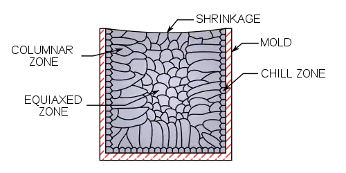 The chill zone is named so because it occurs at the walls of the mold where the wall chills the material. Here is where the nucleation phase of the solidification process takes place. As more heat is removed the grains grow towards the center of the casting. These are thin, long columns that are perpendicular to the casting surface, which are undesirable because they have anisotropic properties. Finally, in the center the equiaxed zone contains spherical, randomly oriented crystals. These are desirable because they have isotropic properties. The creation of this zone can be promoted by using a low pouring temperature, alloy inclusions, or inoculants.[13]