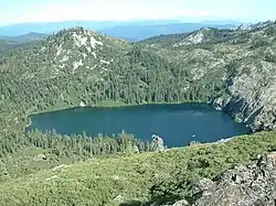 At higher elevations above the lake (especially in rocky or exposed locations), the pine and fir tree forests are thinner, and the trees grow in a more stunted fashion; instead, shrubs and bushes, such as green manzanita (Arctostaphylos patula), dwarf mountain manzanita (Arctostaphylos nevadensis), and tan oak (Lithocarpus densiflorus) find areas and niches to grow.[7] Other shrubs found around the lake are Sierra laurel (Leucothoe davisiae), and the lake is ringed with western azaleas (Rhododendron occidentale), which bloom mostly in June.