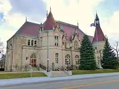 The Castle Museum was designed by William Martin Aiken, the Supervising Architect of the US Treasury, and built in 1898 as a United States Post Office under a federal building program to reflect the ethnic and cultural heritage of its community.[1] Aiken used the influence of the European chateau to illustrate the Saginaw Valley's earliest white settlers-French fur traders and trappers, and combine it with decorations from the Italian Renaissance and Gothic periods.[2] The Castle Building was on the verge of extinction in the 1930s. Unable to keep up with Saginaw's growing mail business, the Castle Post Office Station was too small and plans were made to replace it.[3] A decision was made to tear it down and build a new post office on its site. A storm of protests and a petition signed by 1,000 residents was sent to Washington. The signers of the petition called the building “one of the best and most attractive buildings in Michigan” the replacement order was canceled in 1933.[4] A final decision to demolish was made in February 1935 more protests followed and a compromise was made on February 17, 1935 the building would be extensively remodeled. The building was remodeled by local architect Carl Macomber, who enlarged the building by adding wings on both ends using limestone from the same quarry as the original building, tore down one of the three turrets, and added a large sorting room on the back of the building by Hoyt Library. Construction was completed in 1937 and Postmaster General James A. Farley labeled the building “memorial to President Roosevelt”.[5][4] In the 1970s, a new post office was built and the building was almost demolished once again, but local citizens and the Saginaw County Board of Commissioners took steps to list the building on the National Register of Historic Places to ensure the preservation of the building and the local heritage it represents.[6]