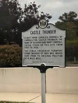 Castle Thunder was a house constructed on Frederick Road in 1787. It belonged to Charles Carroll of Carrollton, the last surviving signer of the United States Declaration of Independence. Carroll gave the home to his daughter, Mary Carroll, and her husband, Richard Caton,[1] after they got married at Annapolis on November 25, 1787.[2] The home stood from 1787 to 1907.[1] The house was used as an inn for travelers. Prior to the American Civil War, a private school was conducted at the house by Carrie Coale and her daughter. In 1907, the house was bought by former Maryland senator John Hubner and torn down to make room for the residence of Arthur C. Montell, a cashier of the First National Bank of Catonsville.[3]