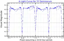 Castor C, or YY Geminorum, was discovered to vary in brightness with a regular period. It is an eclipsing binary with additional variations due to areas of different brightness on the surface of one or both stars, as well as irregular flares.[11] The Castor C components orbit in less than a day. Castor C is believed to be in orbit around Castor AB, but with an extremely long period of several thousand years. It is 73″ distant from the bright components.[16]