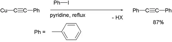 A typical reaction diphenylacetylene is obtained by the coupling of iodobenzene with CuC2C6H5 in hot pyridine:[1]