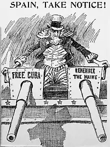 While the destruction of the Maine did not result in an immediate declaration of war with Spain, it did create an atmosphere that precluded a peaceful solution.[14] The Spanish investigation found that the explosion had been caused by spontaneous combustion of the coal bunkers, but the US Sampson Board's Court of Inquiry ruled that the explosion had been caused by an external explosion from a torpedo. The McKinley administration did not cite the explosion as a casus belli, but others were already inclined to go to war with Spain over perceived atrocities and loss of control in Cuba.[15] Advocates of war used the rallying cry, "Remember the Maine! To hell with Spain!"[16][17]