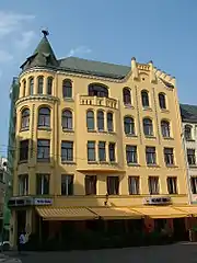 The Cat House (Latvian: Kaķu nams) is a building situated at 10 Meistaru iela in the old town of Riga, the capital of Latvia. It was built in 1909 according to the blueprint of architect Friedrich Scheffel. The building is styled as medieval architecture with some elements of Art Nouveau. It is known for the two cat sculptures, with arched backs and raised tails, on its roof. It is said that the owner of the house wanted the cats to be placed with their tails turned towards the house of the Great Guild, which is nearby, as he held a grudge against its members. It was later ordered that the cats should be turned so as to face the guildhouse.[1]