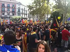 The following month, the CiU, the ERC, the ICV-EUiA and Candidatura d'Unitat Popular (CUP) agreed to hold the independence referendum on 9 November 2014, and that it would ask two questions: "Do you want Catalonia to become a State?" and (if yes) "Do you want this State to be independent?".[43] A further mass demonstration, the Catalan Way 2014, took place on 11 September 2014, when protesters wearing the Catalan colours of yellow and red filled two of Barcelona's avenues to form a giant "V", to call for a vote.[44] Following the Constitutional Court's ruling, the Catalan government changed the vote to a "process of citizen participation" and announced that it would be supervised by volunteers.[43] The Spanish government again appealed to the Constitutional Court, which suspended the process pending the appeal, but the vote went ahead.[45] The result was an 81% vote for yes-yes, but the turnout was only 42%, which could be seen as a majority opposed to both independence and the referendum.[46] Criminal charges were subsequently brought against Mas and others for defying the court order.[45]