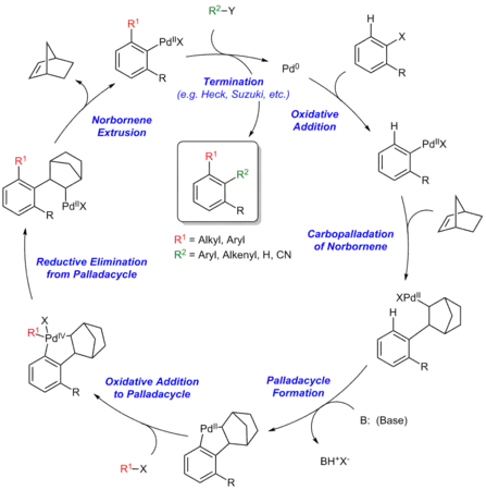 Initially, Pd(0) oxidatively adds into the C–X bond of the aryl halide. Subsequently, the arylpalladium(II) species undergoes carbopalladation with the norbornene. The structure of the norbornylpalladium intermediate does not allow for β-hydride elimination at either of the β-positions due to Bredt's Rule for the bridgehead β-hydrogen and the trans-configuration between palladium and other β-hydrogen.[6] Thereafter, the Pd(II) species undergoes electrophilic cyclopalladation at the ortho position of the aryl group. Subsequently, the palladacyclic intermediate undergoes a second oxidation addition with the alkyl halide coupling partner to form a Pd(IV) intermediate, which undergoes reductive elimination to forge the first C–C bond of the product. After β-carbon elimination of norbornene, the resultant Pd(II) species then undergoes a second C–C bond forming step via a Heck reaction or cross coupling with an organoboron reagent to afford the final organic product and close the catalytic cycle.[7]
