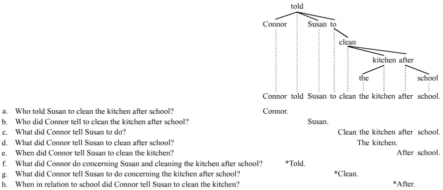 In each of the acceptable answer fragments (a–e), the elided material corresponds to a catena. In contrast, the elided material corresponds to a non-catena in each of the unacceptable answer fragments (f–h).