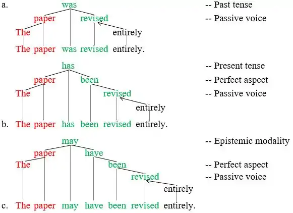 Sentence a contains one auxiliary verb, sentence b two, and sentence c three. The appearance of these auxiliary verbs adds functional information to the core content provided by the content verb revised. As each additional auxiliary verb is added, the predicate grows, the predicate catena gaining links.