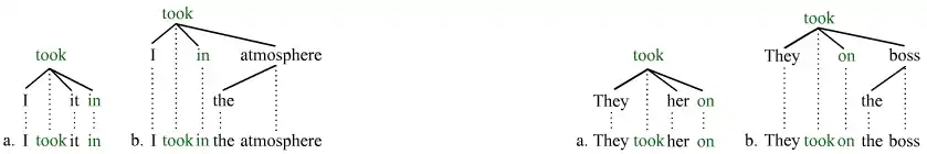 Simple collocations (i.e. the co-occurrence of certain words) demonstrate well the catena concept. The idiosyncratic nature of particle verb collocations provide the first group of examples: take after, take in, take on, take over, take up, etc. In its purest form, the verb take means 'seize, grab, possess'. In these collocations with the various particles, however, the meaning of take shifts significantly each time depending on the particle. The particle and take convey a distinct meaning together, whereby this distinct meaning cannot be understood as a straightforward combination of the meaning of take alone and the meaning of the preposition alone. In such cases, one says that the meaning is non-compositional. Non-compositional meaning can be captured in terms of catenae. The word combinations that assume non-compositional meaning form catenae (but not constituents):