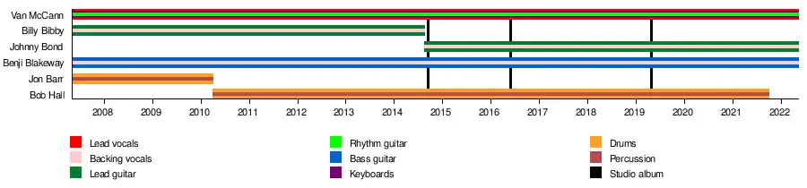 Founding lead guitarist Billy Bibby suddenly and unexpectedly ceased performing with the band in the summer of 2014.[28] and was replaced by Johnny "Bondy" Bond.[29] On 25 July 2014, the band cancelled three festival appearances due to "unforeseen personal circumstances".[30][31] On 13 August 2014, the band posted on Facebook: "Some of you will have noticed that we have been playing with a different guitarist over the past weekend. Unfortunately, due to some personal circumstances, Billy won't be touring with the band for the foreseeable future."[32]