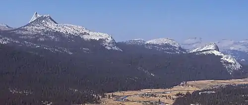 Cathedral Peak was a nunatak during the Tioga glaciation of the last ice age, the peak projected above the glaciers, which carved and sharpened the peak's base while plucking away at its sides.[7][8][9][10]