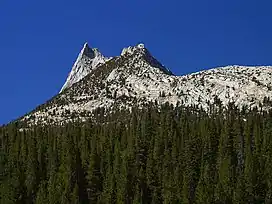 Cathedral Peak is part of the Cathedral Range, a mountain range in the south-central portion of Yosemite National Park in eastern Mariposa and Tuolumne Counties. The range is an offshoot of the Sierra Nevada. The peak which lends its name to the range derives its name from its cathedral-shaped peak, which was formed by glacial activity: the peak remained uneroded above the glaciers in the Pleistocene.