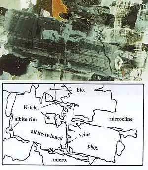 The origin of the microcline in shear zones poses another problem. M.D. Higgins favours the possibility of recrystallization based on Ostwald ripening via metasomatic fluids.[8] L.G. Collins supports a metasomatic subsolidus growth (potassium- and silica-metasomatism) that has been initiated by ongoing tectonic cataclasis.[9] To be fully effective this process is dependent on the cataclastic breaking-up of the original crystals as realized in a ductile shear zone along the eastern edge of the Cathedral Peak Granodiorite (Gem Lake Shear Zone).