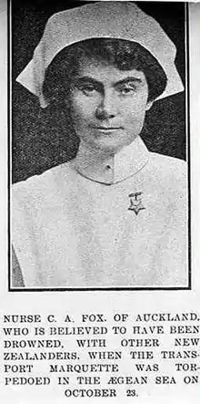 Catherine Anne Fox (18 May 1877 – 23 October 1915) was a New Zealand nurse who served in the First World War and died when the SS Marquette was torpedoed and sunk in 1915.[1][2][3]