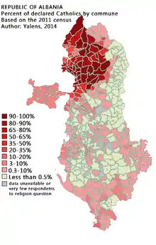 | Share of Catholics in Albania per place (2011 census) [13] | ||