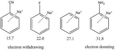 The electronic properties of the substituents also influence the strength of the attraction.[11] Electron withdrawing groups (for example, cyano −CN) weaken the interaction, while electron donating substituents (for example, amino −NH2) strengthen the cation–π binding. This relationship is illustrated quantitatively in the margin for several substituents.