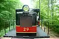 CMRR No. 29, "The Goat" is an Ex-Navy 50 ton H. K. Porter, Inc locomotive, which was a backup engine and main engine for worktrain service. It has a double-reduction gearing system in the trucks. The traction motors are mounted at 90 degrees to the axles and have bevel pinions on the armature shafts. These bevel pinions drive a larger bevel ring gear in a gear case. On one truck, the locking nut on the traction motor armature shaft came loose, and the bevel pinion jammed in the ring gear, locking up the truck. The bevel pinion jammed against the ring gear and bent it. #29 is currently for sale and remains in storage in Phoenicia.