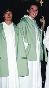 At the beginning chaplain and Caudatario of a cardinal were two distinct figures, but then they merged into one.[4] During the cardinal and papal solemn masses the caudatario was sitting next to the cardinal, holding his cap and reminding him what he had to do.[6] The cardinal's vestments and furnishings were to be prepared by the caudatario to celebrate Mass in his domestic chapel, and to celebrate Mass itself.[6]