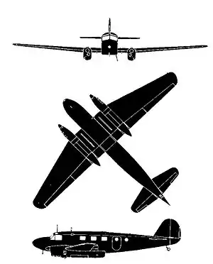 It was a conventionally configured low-wing cantilever monoplane with tailwheel undercarriage. The main undercarriage units retracted into the engine nacelles. Construction was wooden throughout, with wooden skinning everywhere but the forward and upper fuselage sections, which were skinned in metal. As usually configured, the cabin seated six passengers with baggage compartments fore and aft, and a toilet aft.