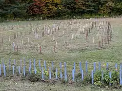 ![]() Site of Caughnawaga with stakes marking the lines of the stockade and long houses. | |