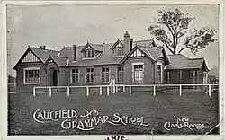 A year after opening, the school had 32 students enrolled. To house the growing student body, the school then moved to a nearby small building, later destroyed in a fire in 1890.[13] In 1896, the school subsumed Hawksburn Grammar School, a smaller local Christian school, situated in Wynnstay Road, Prahran, after Hawksburn's headmaster, Walter Murray Buntine,[14] was appointed as headmaster at Caulfield Grammar. Hawksburn's 55 students subsequently transferred to Caulfield Grammar.[15][16] The current site, a property near Sir Frederick Sargood's Rippon Lea Estate on what is now Glen Eira Road, St Kilda East was purchased in 1909. Classes began on the site on 9 February 1909 and the school's boarding house opened in 1912.[17]