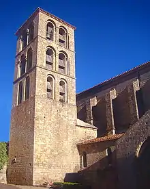 However, Caunes is famed for the large 11th-century apse at the eastern end of the Abbey. This is a fine example of the simple Romanesque building style of the region and is clearest from outside the building. The apse, locally called the chevet, consists of two levels of pillars supporting a conical roof. The older, lower, part is constructed from simply dressed limestone and pink marble and has eight pillars with capitals of interlacing plant design. There are no arches in the lower level, the pillars merely supporting simple stone lintels. There are three simple slit windows in this lower section.