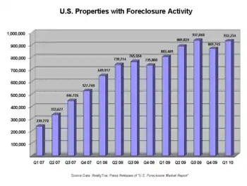 By September 2008, average U.S. housing prices had declined by over 20% from their mid-2006 peak.[18][19] Easy credit, and a belief that house prices would continue to appreciate, had encouraged many subprime borrowers to obtain adjustable-rate mortgages. These mortgages enticed borrowers with a below market interest rate for some predetermined period, followed by market interest rates for the remainder of the mortgage's term. Borrowers who could not make the higher payments once the initial grace period ended would try to refinance their mortgages. Refinancing became more difficult, once house prices began to decline in many parts of the US. Borrowers who found themselves unable to escape higher monthly payments by refinancing began to default. During 2007, lenders had begun foreclosure proceedings on nearly 1.3 million properties, a 79% increase over 2006.[20] This increased to 2.3 million in 2008, an 81% increase vs. 2007.[21] As of August 2008, 9.2% of all mortgages outstanding were either delinquent or in foreclosure.[22]