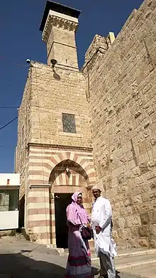 In 1188 Saladin conquered the area, reconverting the enclosure to a mosque but allowing Christians to continue worshipping there. Saladin also added a minaret at each corner—two of which still survive—and added an existing minbar (pulpit) from Ashkelon to the mosque's interior.[31][42] Samuel ben Samson visited the cave in 1210; he says that the visitor must descend by twenty-four steps in a passageway so narrow that the rock touches him on either hand.[43]