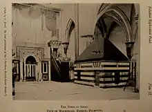 At the center of the northeastern side, there is another entrance, which enters the roofed area on the southeastern side of the northwestern section and through which access can also be gained to the southeastern (fully roofed) section. This entrance is approached on the outside by a corridor which leads from a long staircase running most of the length of the northwestern side.[63] The southeastern section, which functions primarily as a mosque, contains two cenotaphs, symmetrically placed, near the center, dedicated to Isaac and Rebecca. Between them, in the southeastern wall, is a mihrab. The cenotaphs have a distinctive red and white horizontal striped pattern to their stonework but are usually covered by decorative cloth.