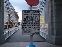 When Cavenagh Bridge became unable to cope with the increasing traffic into town and its low draught was insufficient for the passage of boats at high tide, the government decided to build the Anderson Bridge in 1910 to replace Cavenagh Bridge. Cavenagh Bridge was eventually spared from demolition and was converted to a pedestrian bridge, with the road traffic diverted to the Anderson Bridge. A police notice, which is still preserved until today, was thus erected at both ends of the bridge restricting the passage of vehicles that weighed beyond 3 cwt (152 kilograms or 336 pounds), including cattle and horses. The sign reads: