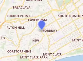 The suburbs of Balaclava and Maryhill lie to the north, close to the western end of the ridge that runs along the northern edge of central Dunedin. These hills were all once part of the rim of the Dunedin volcano, the long-extinct crater of which now forms Otago Harbour.[4] Other suburbs nearby include Forbury, South Dunedin, Kensington, and Lookout Point.