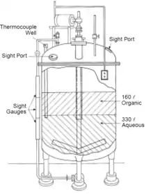 Cecil Kelley was a 38-year-old chemical operator with 11 years of experience; he had spent more than half of this time at the Los Alamos lab, where one of his duties was to operate a large, 1000-liter capacity, stainless-steel mixing tank. The tank contained residual plutonium-239—a mostly man-made element existing in trace amounts in nature—from other experiments and applications, along with various organic solvents and acids in an aqueous solution for the purpose of recovery and reuse. In pure form and under normal temperature and pressure conditions, plutonium is a solid, silvery metal. It tarnishes quickly when exposed to air and readily dissolves in concentrated hydrochloric, hydroiodic, and perchloric acids,[2] as well as others. On the day of the accident, the mixing tank was supposed to contain a "lean" concentration of dissolved plutonium (≤0.1 g of plutonium per liter of solution) in a bath of highly corrosive nitric acid and a caustic, stabilized, aqueous, organic emulsion.[3] However, the concentration of plutonium in the mixing tank was nearly 200 times higher than Kelley anticipated as a result of at least two improper transfers of plutonium waste to the tank[4] from undetermined sources. Additionally, the plutonium was distributed unevenly, with the upper layer of solution containing especially high concentrations, amounting to a total of over 3 kg of plutonium, dangerously close to criticality. When Kelley switched on the mixer, a vortex began to form. The denser aqueous layer within the tank was forced outward and upward forming a "bowl", and the less dense, plutonium-rich layer was drawn toward the vessel's center.[5]