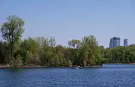 ![]() Cedar Lake in 2012. Downtown Minneapolis skyline is visible in the background. | |