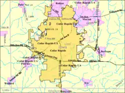 As of the 2020 United States Census, the city population was 137,710.[5][6] The estimated population of the three-county Metropolitan Statistical Area, which includes the nearby cities of Marion and Hiawatha, was 255,452 in 2008.[7] Cedar Rapids is an economic hub of the state, located at the core of the Interstate 380 corridor. The Cedar Rapids Metropolitan Statistical Area (MSA) is also a part of a Combined Statistical Area (CSA) with the Iowa City MSA.