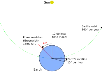 The considerably more popular method was (and still is) to use an accurate timepiece to directly measure the time of a sextant sight. The need for accurate navigation led to the development of progressively more accurate chronometers in the 18th century (see John Harrison). Today, time is measured with a chronometer, a quartz watch, a shortwave radio time signal broadcast from an atomic clock, or the time displayed on a satellite time signal receiver.[4] A quartz wristwatch normally keeps time within a half-second per day. If it is worn constantly, keeping it near body heat, its rate of drift can be measured with the radio and, by compensating for this drift, a navigator can keep time to better than a second per month. When time at the prime meridian (or another starting point) is accurately enough known, celestial navigation can determine longitude, and the more accurately latitude and time are known the more accurate the longutude determination. The angular speed of Earth is latitude dependent. At the poles or latitude 90° the rotation velocity of Earth reaches its minimum at 0 m/s (0 ft/s). At latitude 45° one second of time is equivalent in longitude to 1,077.8 ft (328.51 m), or one-tenth of a second means 107.8 ft (32.86 m).[5] At the slightly bulged out equator or latitude 0° the rotation velocity of Earth or its equivalent in longitude reaches its maximum at 465.10 m/s (1,525.9 ft/s).[6]