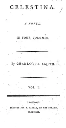 Celestina was published in four volumes in 1791 by Thomas Cadell, who had previously published Smith's Elegiac Sonnets, Emmeline, and Ethelinde. Cadell had become her friend and mentor, but he was averse to the radical views expressed in her works and refused to publish her next two novels, Desmond (1792) and The Old Manor House (1793).[21] Celestina eventually ran to four English editions and a French translation, Celestine, ou la Victime des Préjugés, appeared in 1795. The novel was not published again in English until the Broadview Press edition of 2004.[22]