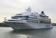 After MS Olympia replaced her on the Helsinki — Stockholm route in April 1986, the Viking Saga was rebuilt for use as a cruise ship at Wärtsilä Helsinki New Shipyard.[2] She did not become a "real" cruise ship as her cardecks were not built in. During conversion there was a fire on board, but it was extinguished by the shipyard staff.[6] Renamed Sally Albatross, the ship entered service for the new Sally Cruise brand in May 1986. She was mainly used for cruising around the Baltic Sea from Helsinki.[2] In 1987 Rederi Ab Sally was sold to its rivals Effoa and Johnson Line.[2] In January–February 1988 the Sally Albatross was comprehensively rebuilt at Schichau Seebeckwerft, Bremerhaven, West Germany, where additional cabin were built on the former upper cardeck, the forward superstructure was built to a more streamlined appearance and smaller changes were made to the bow and other parts of the superstructure.[6] At the same time the ships livery was altered, in addition to the light and dark blue stripes running along the hull black stripes were painted along the windows of the superstructure, giving the ship an even more streamlined appearance. The cost of the reconstruction was 35 million Finnish markka.[2]
