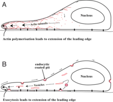 The front of a migrating cell is also the site at which the membrane from internal membrane pools is returned to the cell surface at the end of the endocytic cycle.[16] [17] This suggests that extension of the leading edge occurs primarily by addition of membrane at the front of the cell. If so, the actin filaments that form there might stabilize the added membrane so that a structured extension, or lamella, is formed — rather than a bubble-like structure (or bleb) at its front.[18] For a cell to move, it is necessary to bring a fresh supply of "feet" (proteins called integrins, which attach a cell to the surface on which it is crawling) to the front. It is likely that these feet are endocytosed [19] toward the rear of the cell and brought to the cell's front by exocytosis, to be reused to form new attachments to the substrate.