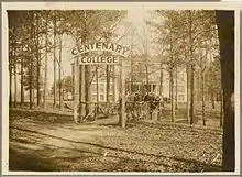 In 1846, the college's trustees changed the institution's name to Centenary College of Louisiana and adopted the alumni of the two predecessor colleges.[7] During the 1850s, enrollment reached 260, and the college constructed a large central building, which included classrooms, laboratories, literary society rooms, a library, a chapel, offices, and an auditorium with seating for over 2,000 people.[8] This prosperity halted with the American Civil War. Following a meeting on October 7, 1861, the faculty minute book states, "Students have all gone to war. College suspended; and God help the right![9]" During the war, both Confederate and Union troops occupied the campus’ buildings.[10] Centenary reopened in the fall of 1865, though struggled financially through the remainder of the nineteenth century. In 1906, the Louisiana Conference of the Methodist Episcopal Church, South, accepted an offer from the Shreveport Progressive League to relocate the college.[11] The Jackson campus now serves as the Centenary State Historic Site operated by the Louisiana Office of State Parks; it is listed on the National Register of Historic Places.[10]