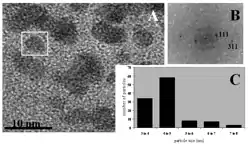 (A) HRTEM image showing ZnS:Mn2+ NPs of size between 4 and 6 nm. Crystallites are around 2 to 3 nm. (B) Fast Fourier Transform done on the squared area (C) Particle size distribution (100 particles sampled)