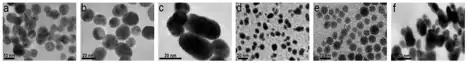Micrographs of Au & Ag NPs. (a) Au10, (b) Au25, (c)Auai, (d) Ag10, (e) Ag25, and (f) Agai