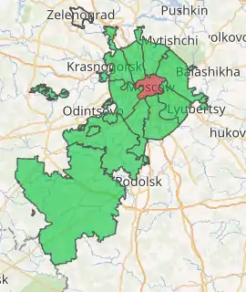 Central Administrative Okrug, or Tsentralny Administrativny Okrug (Russian: Центра́льный администрати́вный о́круг, Tsentralny administrativny okrug), is one of the twelve administrative okrugs of Moscow, Russia. Population: 741,967 (2010 Census);[1] 701,353 (2002 Census).[2] It is the core of the city that includes its oldest, historical parts: Kremlin and the former Bely Gorod and Zemlyanoy Gorod; with certain churches and fortifications as old as from XIV-XV centuries. It is also the site of Russia's highest government institutions, such as the Government house, the State Duma, the Federation Council, and most ministries. A large part of the territory is occupied by office buildings, especially in the “Moscow-City” business district on the west side of the Okrug.