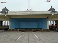 The Central Bandstand with its 1932 frontage has been described as an art deco landmark, and one of the first reinforced concrete structures in the UK.[2][3] It straddles the beach and Central Parade just east of the Clock Tower. The back or seaward half, built in 1924, was originally supported above the beach on concrete pillars sheathed in cast iron, so that the stage was level with the main thoroughfare.[4] The tide used to go in and out under the building until at least the 1950s. During World War II when the Pier was out of bounds, anglers were permitted to fish from the rooftop balcony.[5] As of 2013 the beach has risen so that the piers are no longer visible and the sea has receded away from the Bandstand.