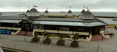 In January 1987 Clipperview leased and renovated the building then reopened it in April, with Margate Majorettes and Whitstable Brass performing.[37] The Herne Bay Visitor Information Centre was located in the south-east corner of the building from 1988 until the end of 2008; it was relocated to Council offices in Canterbury in January 2009.[38][39] As a consequence of the closure, the Herne Bay Times said that "Lily, the 12ft Herne Bay giant, and Belle, her 15ft friend, have been made homeless."[34] It is not known what these artefacts were. By 2000 skateboarders, rollerbladers and cyclists had damaged the stage, and had been banned from the building.[40] As of 2013 the front of the building hosted a bandstand cafe bar and an Indian restaurant called the Maharajah. In 2009 Makcari's coffee lounge and ice cream parlour took over the vacant space left by the information centre.[41]