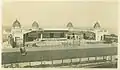 It was first called the New Bandstand, and then the Central Bandstand, to differentiate it from other bandstands in Herne Bay, especially the bandstand which stood on the roof of the King's Hall and has since been demolished. The north or seaward side of the Central Bandstand was built in 1924, with alterations in 1931.[5] The original architect was Herbert Kempton Dyson, M.I.Struct.E (1880–1944), who was a founder member of the Concrete Institute, and specialised in reinforced concrete structures.[3][6][7] The 1924 section has two outside seaward-facing balconies with space for deckchairs, including a cantilevered roof for the lower deck and for covering the stage inside. Metal, glazed screens at the east and west sides of the building crossed the promenade, and could be moved to protect the audience from wind, or retracted into the wings to allow promenaders to cross when no band was playing.[4][6] The seating area was a railed-off section of the promenade, and the seating on the roof above the stage included two copper-covered domes, plus two domes which doubled as refreshment kiosks.[4] The roof is now inaccessible for safety reasons.[4] By the late 1920s the audience area in front of the stage had extended across Tower Gardens to the edge of the footpath and road.[8]